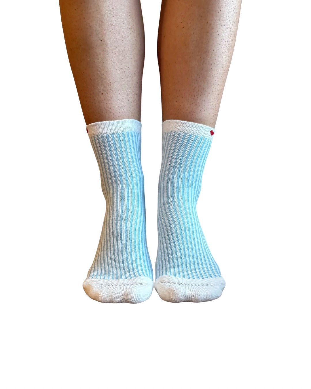 These socks feature an ivory base with a baby blue pinstripe, a pattern celebrated for its classic, timeless appeal. An ivory trim frames the edge, while three deep red hearts add a playful touch to the sock cuff. Finished with baby blue grip on the sole, they blend nostalgic charm with modern functionality, perfect for adding a little character to every step.